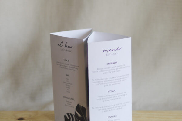 – Tamaño Ideal: Con medidas de 10×21 cm por lado, los trípticos son lo suficientemente compactos para no ocupar demasiado espacio en la mesa, pero lo suficientemente llamativos para captar la atención de tus invitados.
